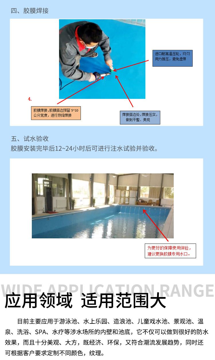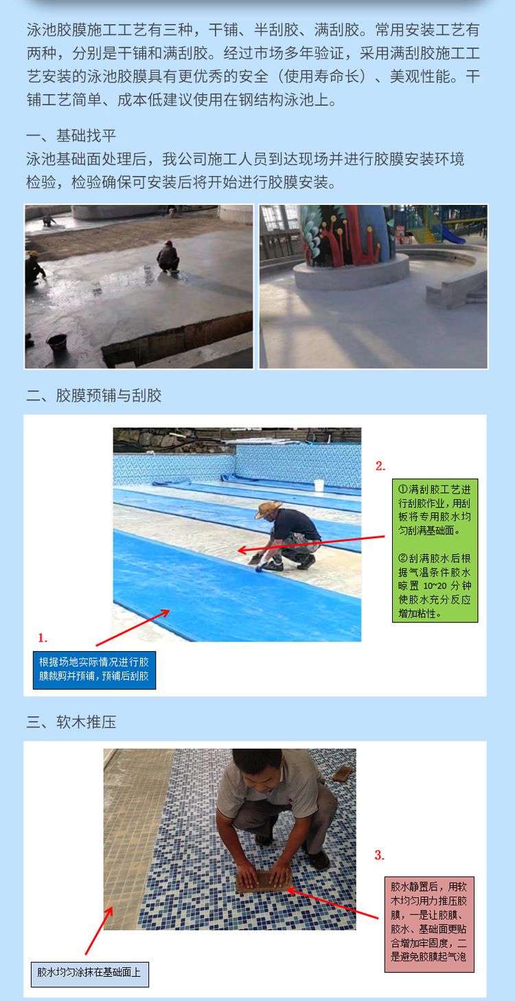 好多朋友對(duì)游泳池膠膜施工方法流程還是搞不清楚,不知道怎么做,看了不少的視頻也聽了不少的講解,但是操作的時(shí)候還是不明不白的,我們作為游泳池膠膜廠家,給大家以圖文并茂的形式講解一下,希望給朋友帶來更大的幫助。